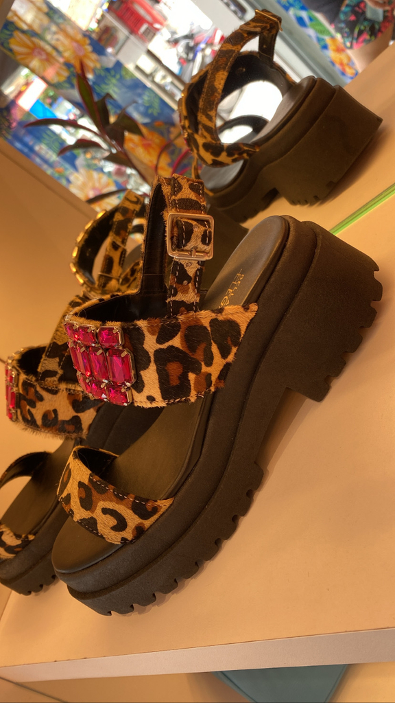 Cor: Preta, com pedraria rosa e detalhe de estampa de onça.