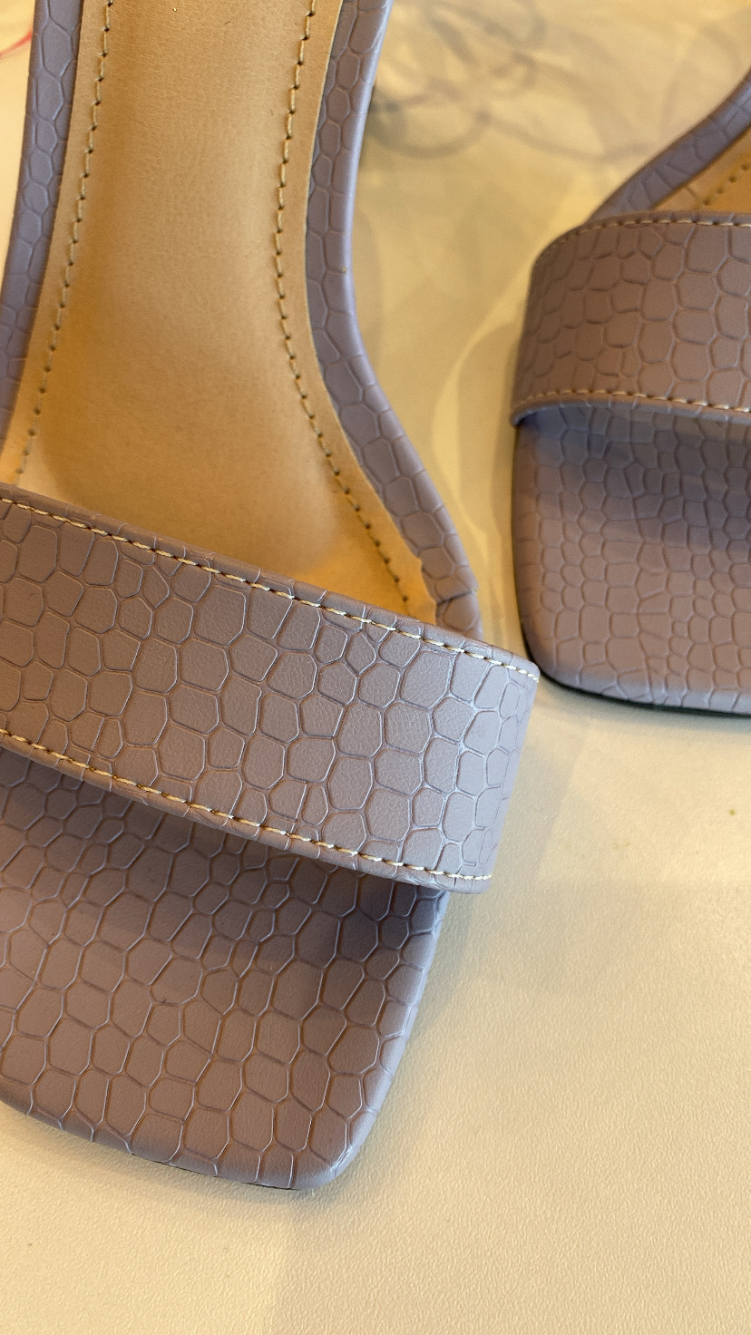 Um salto cheio de estilo, com duas formas de você usar e se diverti criando varias composições. Pode ser usada com sua tira de fivela ou com sua amarração ousada, podendo ficar mais alta ou mais baixa quem decide e você se jogue e usa sua criativade. Na cor lavanda, com um leve textura de croco na tira da frente, APOSTEM !!!