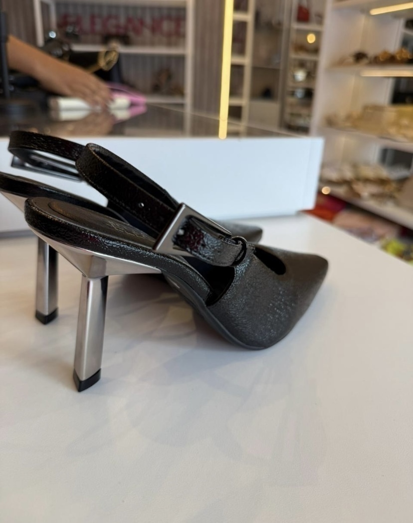 O salto de 10 cm chama a atenção, não só pela altura ideal para valorizar sua postura, mas também pelo design diferenciado: ele é todo prata, trazendo um toque moderno e sofisticado. Além disso, a max fivela adiciona um charme único, deixando o scarpin ainda mais especial e estiloso.
